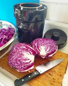 To measure the amount of cabbage you will need. Take your fermenting container (jar, crock, etc.) and use raw cleaned/dried off cabbage and chop up enough to fill the container twice. Chop to desired bite size.