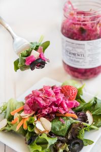 Take your cabbages and cut in half, quarter, then remove core. Chop to desired bite size. Fill Quart jar 2 times with this chopped cabbage, emptying that cabbage into your mixing bowl. Cut your apple in half, quarter, then remove seeds/core. Chop to desired bite size. Only put ½ Cup of Apple into 1 Quart recipe. Put apple into your mixing bowl. Chop fennel to desired bite size and add amount to your taste in mixing bowl. Add 1 Tablespoon Sea Salt to your mixing bowl. Lightly massage your ingredients to help break down the cellular structure, until mixture “weeps”. Take your clean and empty Quart jar and pack your sauerkraut mixture into the jar, gently pressing down to remove air bubbles. Do this in layers till you reach just below the jars’ “shoulder”. Then place your clean and empty 4oz jelly jar inside the Quart jar to act as a weight to keep the vegetable matter under the brine. Make sure the veggie matter is under the brine. Place your 2-piece band and lid on the jar, but do not tighten all the way. Or you can use the FERMENTI FERMENTATION Kit’s airlock and lid. You want the jar to be able to “exhale” the off gassing caused by fermentation, so it will not explode on you. Place Quart jar in a small bowl to catch any overflow. Place in your kitchen out of direct sunlight and away from heat. Primary fermentation takes 3-5 days. You can ferment it as long as you wish. The longer it ferments the deeper the flavor and the softer the vegetables become.